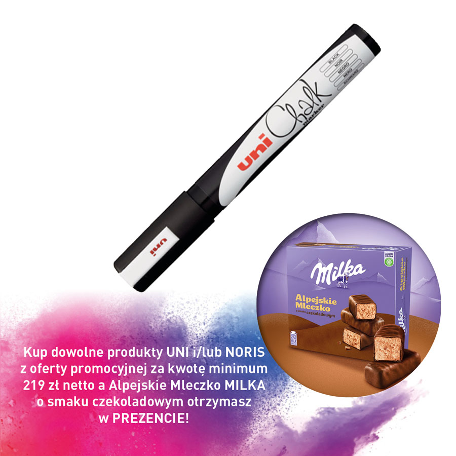 Kup dowolne produkty UNI i/lub NORIS z oferty promocyjnej za kwotę minimum 219 zł netto a Alpejskie Mleczko MILKA o smaku czekoladowym otrzymasz w PREZENCIE!