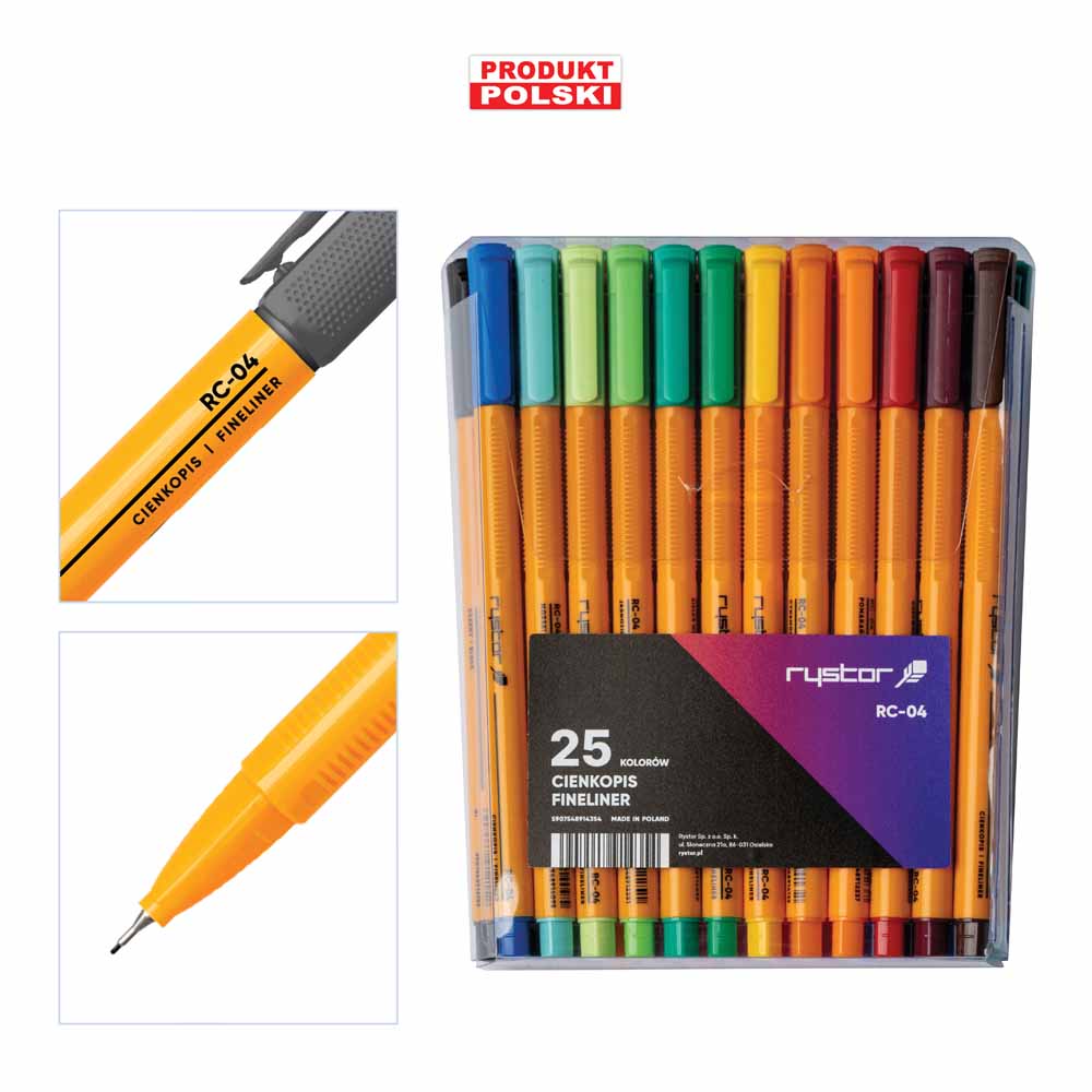 fibrowa końcówka oprawiona w metal, odporna na rozwarstwianie się obudowa w kolorze tuszu o heksagonalnym kształcie i paskami w wzdłuż obudowy, w kolorach obudowy: czerwonym, niebieskim, zielonym- pasek koloru czarnego, w czarnym kolorze obudowy pasek koloru szarego wentylowana skuwka w kolorze tuszu o heksagonalnym zakończeniu tusz na bazie wody, odporny na wysychanie bezzapachowy nietoksyczny długość linii pisania: 500-600m linia pisania: 0,4mm końcówka: 0,4mm występuje w 4 kolorach (czarny, czerwony, niebieski, zielony) w op. po 10 szt. w jednym kolorze oraz w kompletach w etui – mix 4 kolory na każdym cienkopisie nazwa modelu D-fine, marki Donau oraz grubość 0,4mm idealny do tworzenia kolorowych notatek, pracy z szablonem itp. do użytku w biurze, szkole oraz w domu obudowa wykonana z PP ISO 9001 kolor: niebieski